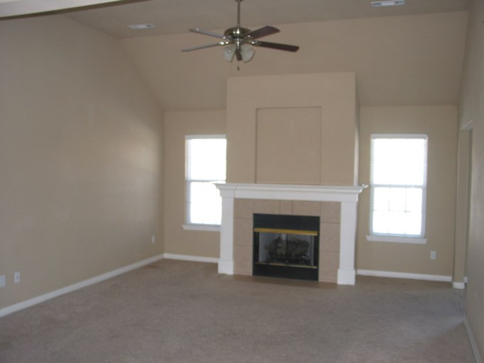 Family room with natural gas fireplace and high ceilings